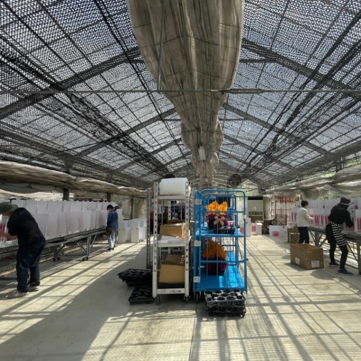 (熊本県の花農家でのお手伝い。ひとつひとつ、丁寧に、かつ素早く作業を進めていきます)